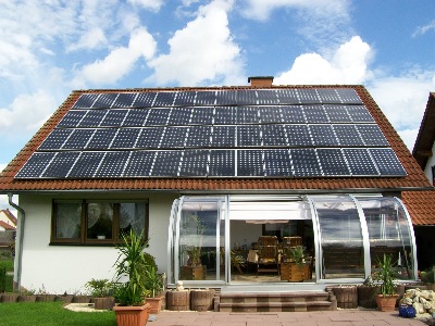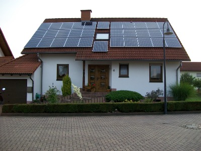 Hier seht ihr unser Haus von der Gartenseite. 56 x BP 4165 mit 165Wp.